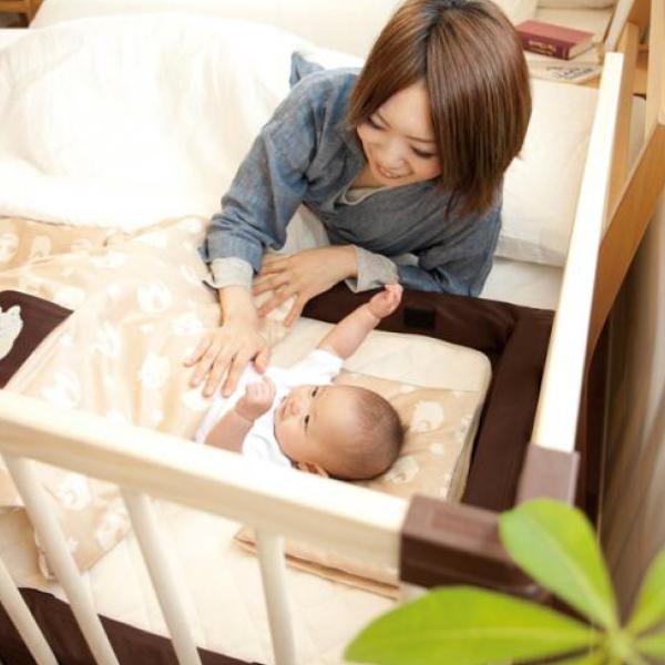 ベッドに沿わせて添い寝ができるベビーベッド。