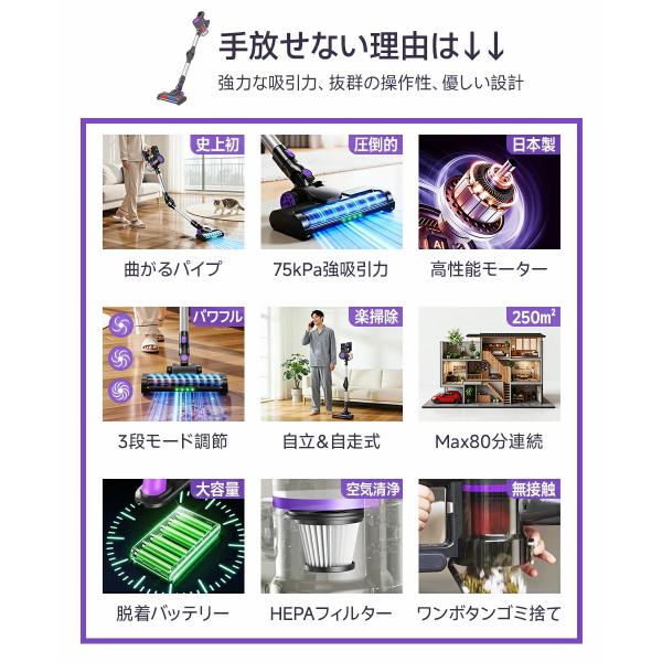 掃除機 コードレス 75kPa吸引力 自立式 自走式 曲がるパイプ 伸縮パイプ 強力吸引 6IN1 HEPAフィルター ハンディ掃除機 取外しバッテリー ハンディクリーナー