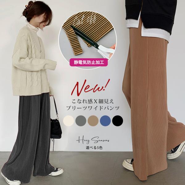 切れるパンツ プリーツパンツ 光沢感 春秋 縦ライン 高見え リブパンツ プリーツ パンツ ワイドパンツ 秋冬OK 裾カットOK カジュアルパンツ 無地(Hpt501.He.M)