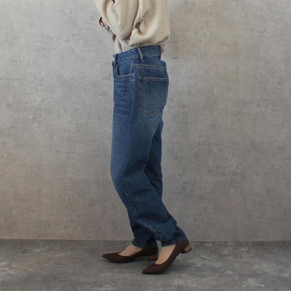 ストレートデニムを裾脇をカーブさせて