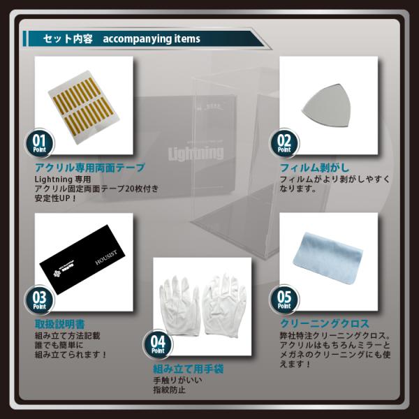 組立説明書付、クリーニングクロスや取り扱い用手袋、フィルム剥がしやアクリル固定用テープ等、付属品も充実!コレクターにおすすめの逸品です。