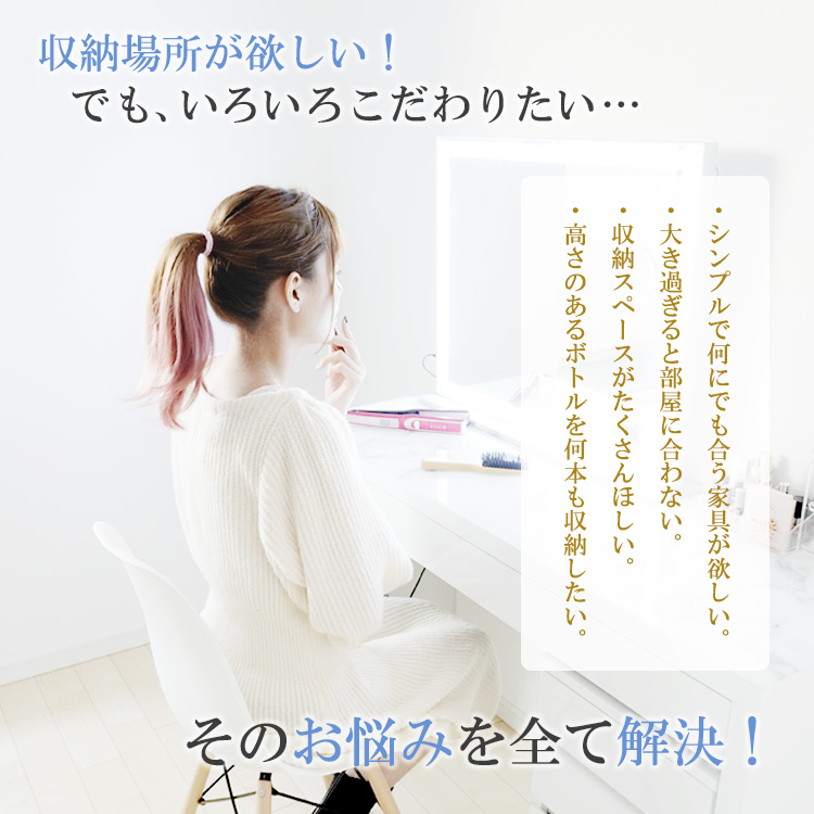 下段の引き出しは化粧ボトルやヘアケアスプレー、ボトルタイプが多い基礎化粧品など収納できます。