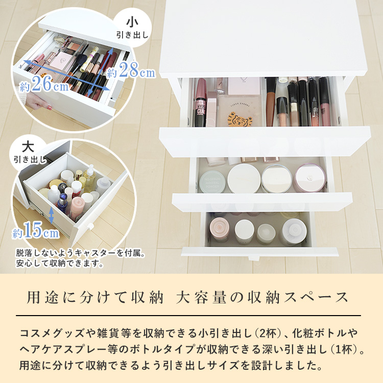小引き出しには化粧品やコスメ用品、小物がたくさん収納できます。