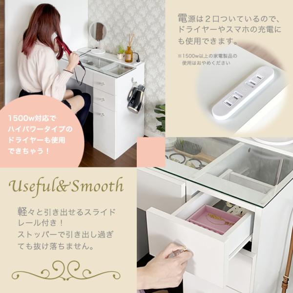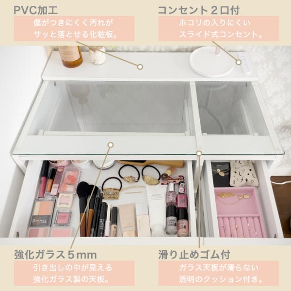 ドレッサー スツール付き ハイタイプ 引出し4杯 コンセント付 ガラステーブル ティッシュボックス付 椅子付き 収納 メイク台 可愛い おしゃれ メイク台 メイクボックス コスメ収納 ホワイト 地球家具 Alice アリス