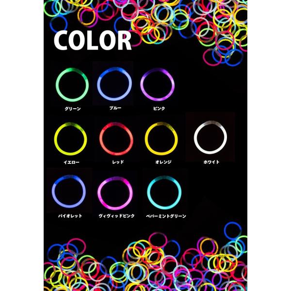 10色入りの光るブレスレット、お買い得品の登場です!使い方はとっても簡単、パキッと折るだけで発光します。しかも、発光力・発光時間に自信あり!お祭りやライブ、パーティーなど、盛り上がりを演出する」のに最適です。 コネクターがついていますので、ブレスレットとしてもお使いいただけます。 おしゃれで実用的なサイリウムライト、ぜひお試しください!