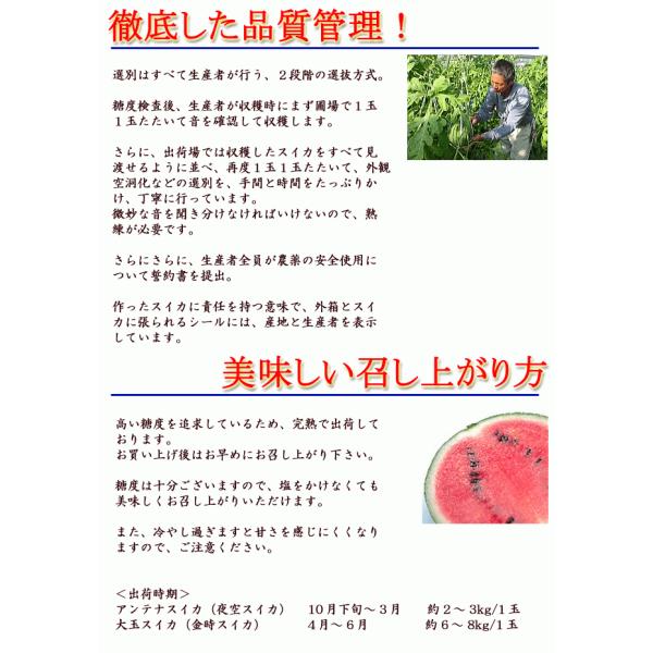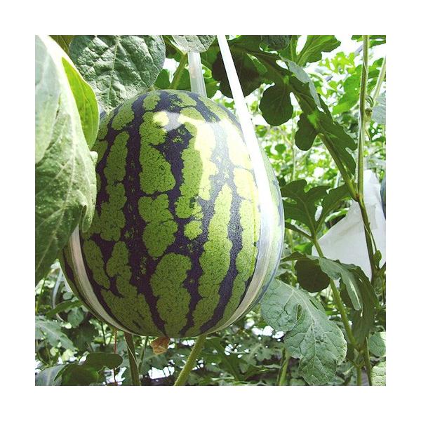 【特徴】1本の苗に1つだけしか作らず、特製のゆりかごに入れて育てる「立体栽培」で、すいかの葉や実が太陽の光を1日中まんべんなく受けられるように育てました。そのため糖度がたかく、コクのある美味しいすいかに仕上がっています。