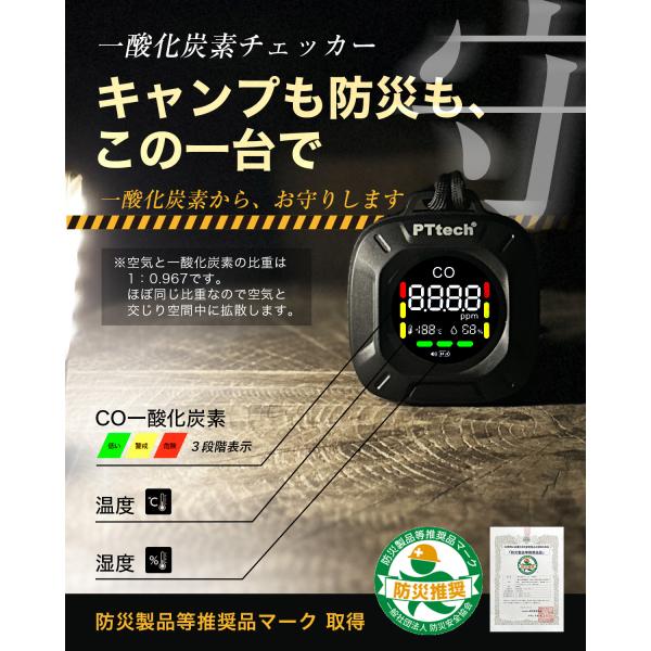 一酸化炭素チェッカー PT002BK【防災製品等推奨品認証】PTTech キャンプ ミニ 送料無料 電池つき 一酸化炭素警報器 車中泊 ブラックギア(スクエアブラック)