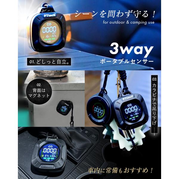キャンプ・車中泊・ストーブ使用時の安全対策に便利な3in1モデル(CO・温度・湿度表示)。電気化学式センサーでCO濃度をひと目で確認できます。軽量で持ち運びやすく、50ppm以上で自動アラームを発報。サウンドON/OFF切替も可能で、アウトドアシーンでも使いやすい設計です。