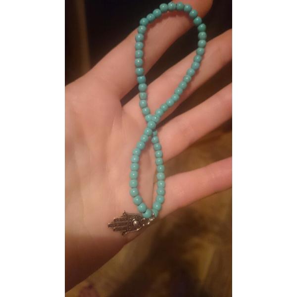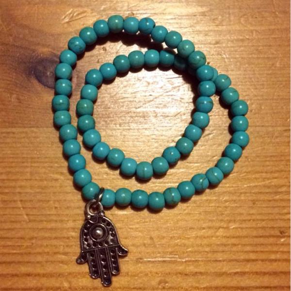 ターコイズブルーのビーズにハムサモチーフのチャームが可愛い