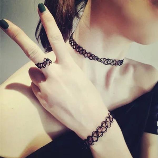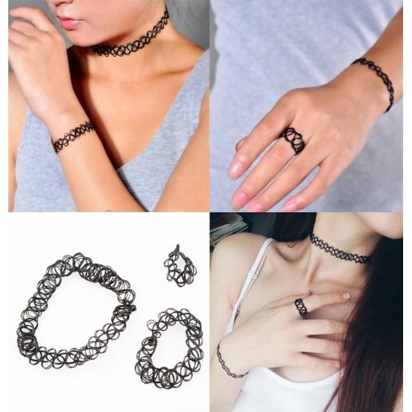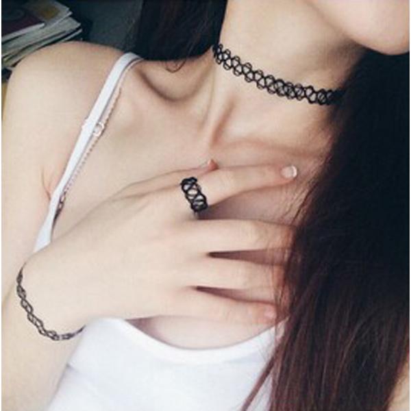 弾性タトゥーチョーカー3点セット(ネックレス、リング、ブレスレット)