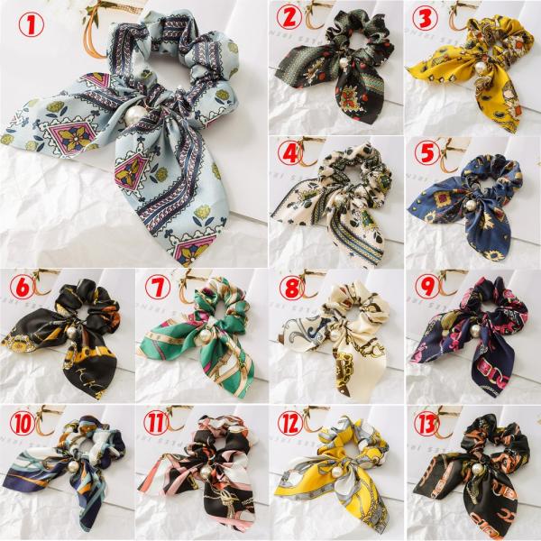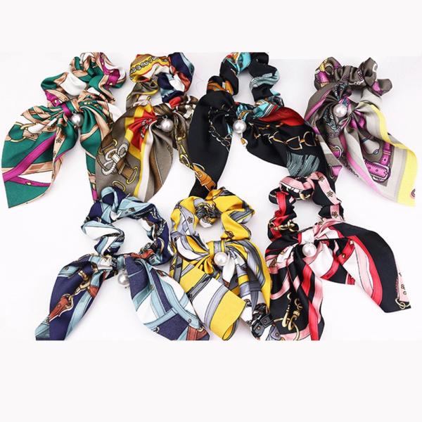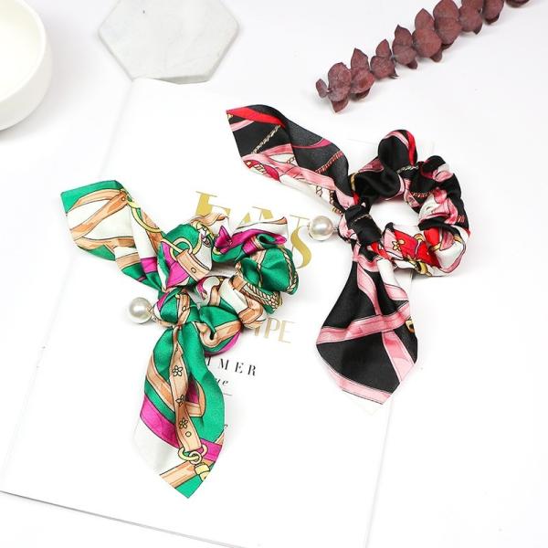 シュシュ リボン パール プリント柄 スカーフ ヘアアレンジ ヘアアクセサリー 大きめ ヘアアレンジ エレガント シニヨン まとめ髪