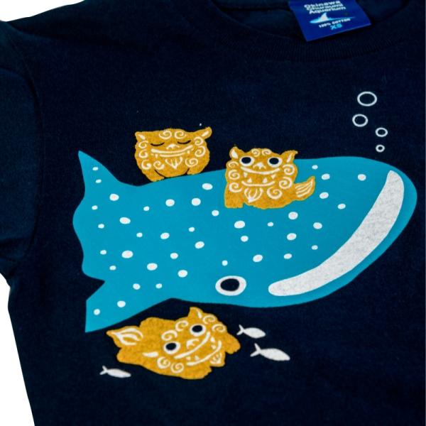 シーサーくんが沖縄美ら海水族館の人気者ジンベエザメとナンヨウマンタと仲良く泳ぐデザインが可愛らしい一着!
