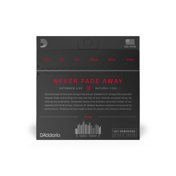D'Addario XTC45 XT Composite Normal Tension クラシックギター弦ノンコーティング弦のような自然なトーンと感触に加え、かつてない長寿命化を実現。強度、ピッチ安定性、耐腐食性においてもこれまでのコーティ ング弦にはなかった高いパフォーマンスを誇る弦がついに完成しました。●ナチュラルなトーンノンコーティング弦の倍音と同じくらい長く明瞭なトーンを奏でます。●抜群のピッチ安定性従来の弦に比べ131%もチューニングの安定性が向上しました。●ピッキング時の強度向上強度テストにより最大で42%も強度がアップし切れにくくなりました。<XTC45>XT Classical Silver Plated Copper, Normal Tension1st:0.0282nd:0.0323rd:0.0404th:0.028W5th:0.035W6th:0.044W