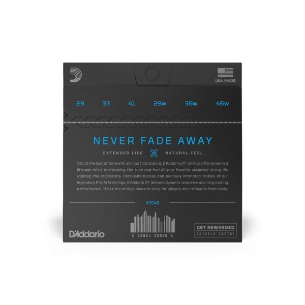 D'Addario XTC46 XT Composite Hard Tension クラシックギター弦ノンコーティング弦のような自然なトーンと感触に加え、かつてない長寿命化を実現。強度、ピッチ安定性、耐腐食性においてもこれまでのコーティ ング弦にはなかった高いパフォーマンスを誇る弦がついに完成しました。●ナチュラルなトーンノンコーティング弦の倍音と同じくらい長く明瞭なトーンを奏でます。●抜群のピッチ安定性従来の弦に比べ131%もチューニングの安定性が向上しました。●ピッキング時の強度向上強度テストにより最大で42%も強度がアップし切れにくくなりました。<XTC46>XT Classical Silver Plated Copper, Hard Tnesion1st:0.0292nd:0.0333rd:0.0414th:0.029W5th:0.036W6th:0.046W
