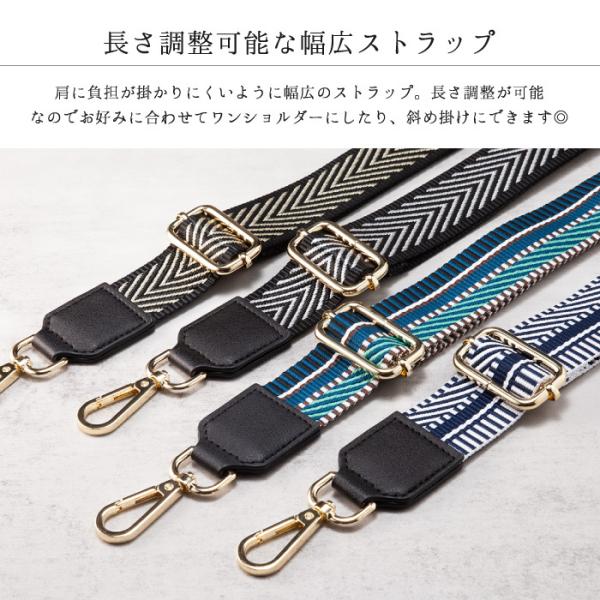肩に負担が掛かりにくいように幅広のストラップで、長さ調整が可能な仕様なので お好みに合わせてワンショルダーにしたり、斜め掛けにできます◎