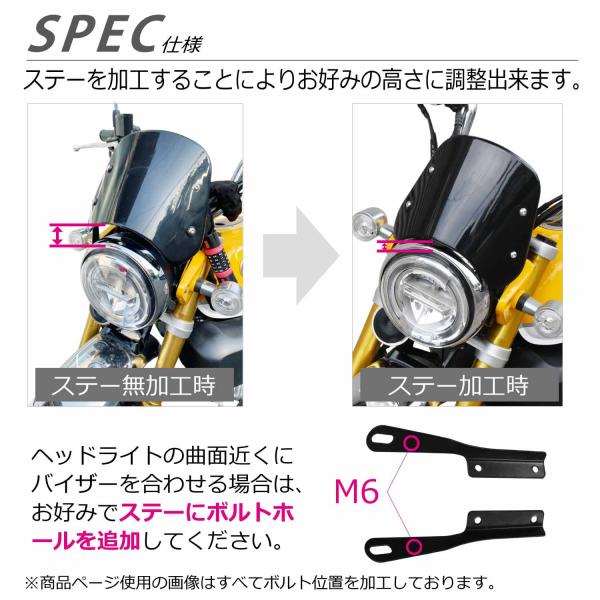 ・バイザーの位置をヘッドライト側に近く(低く)する場合は、ステーにボルトホールを追加してお取り付けください。
