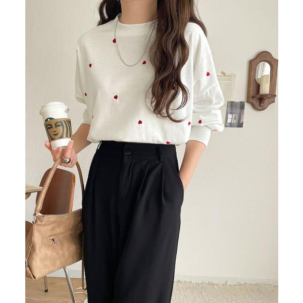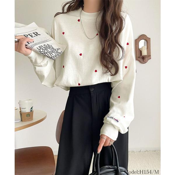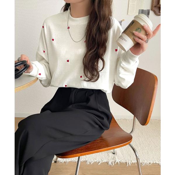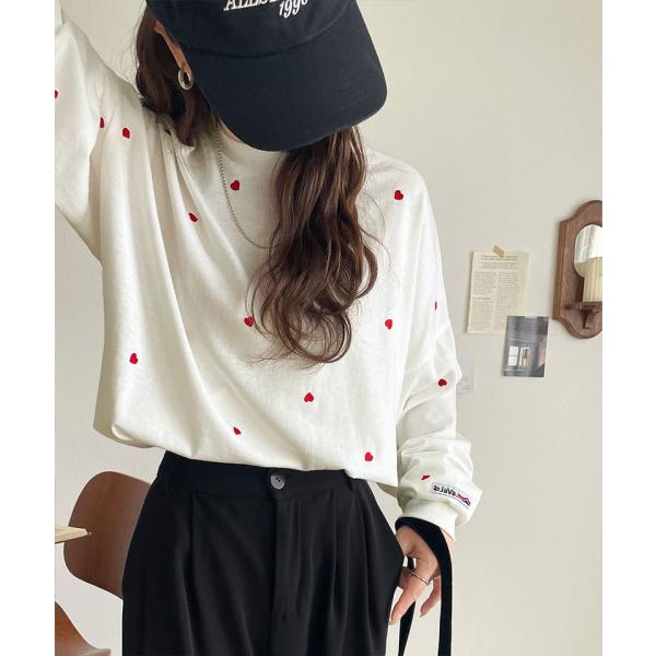《JaVaジャバコラボ》 トップス Tシャツ レディース 袖 ネーム 付き ミニ ハート 総 刺繍 長袖 Tee 大きいサイズ 秋 冬