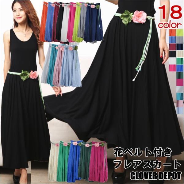 フレアスカート マキシ ロング レディース コーデ 黒 ウエストゴム マキシ丈 ベルト付き フレア 無地 ドレープ 花ベルト