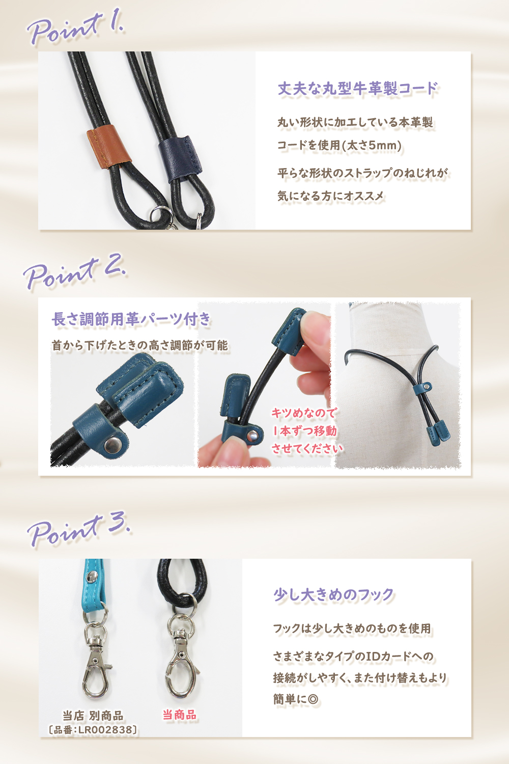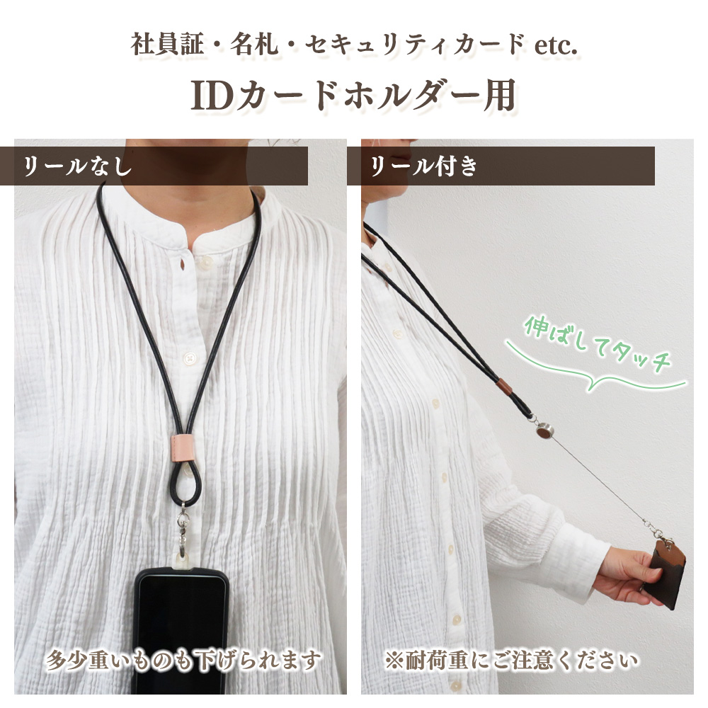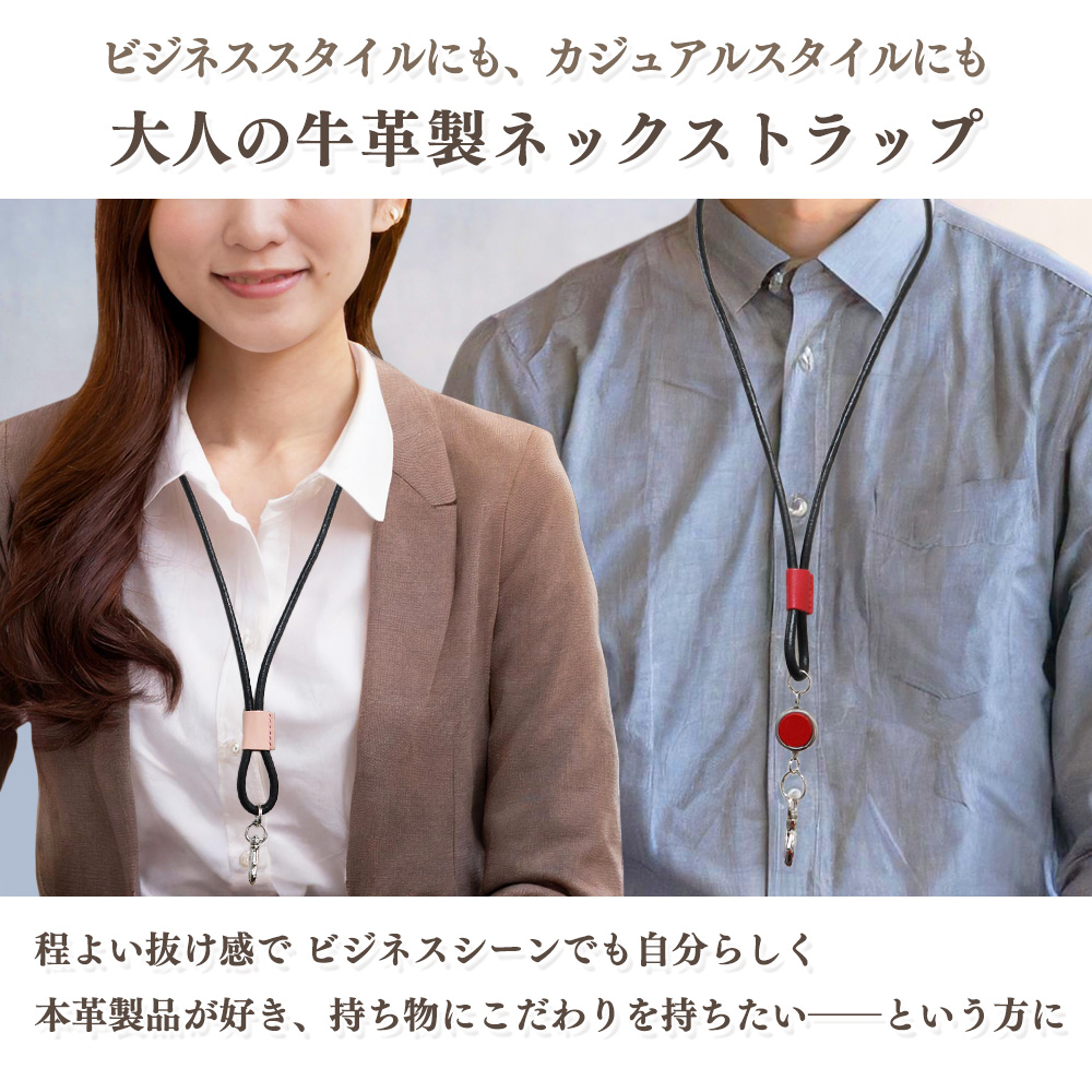 お手持ちの社員証や名札などIDカードホルダーなどを首から下げる用のレザーコードストラップです。