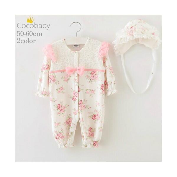 ■商品名:セレモニードレス 退院着 お宮参り ロンパース 前開き 女の子 長袖 帽子 お食い初め ベビー服 花柄 秋 春 綿 50 60 70 ホワイト ピンク 結婚式 雛祭り 100日 保育園 入園式