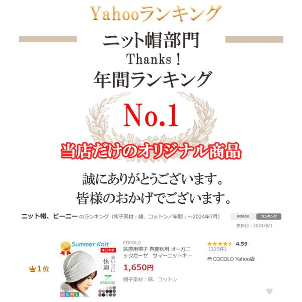 医療用帽子 春夏秋用 オーガニックガーゼ サマーニットキャップ 日本製 メンズ レディース 抗がん剤副作用 脱毛 手術後用ケア帽子