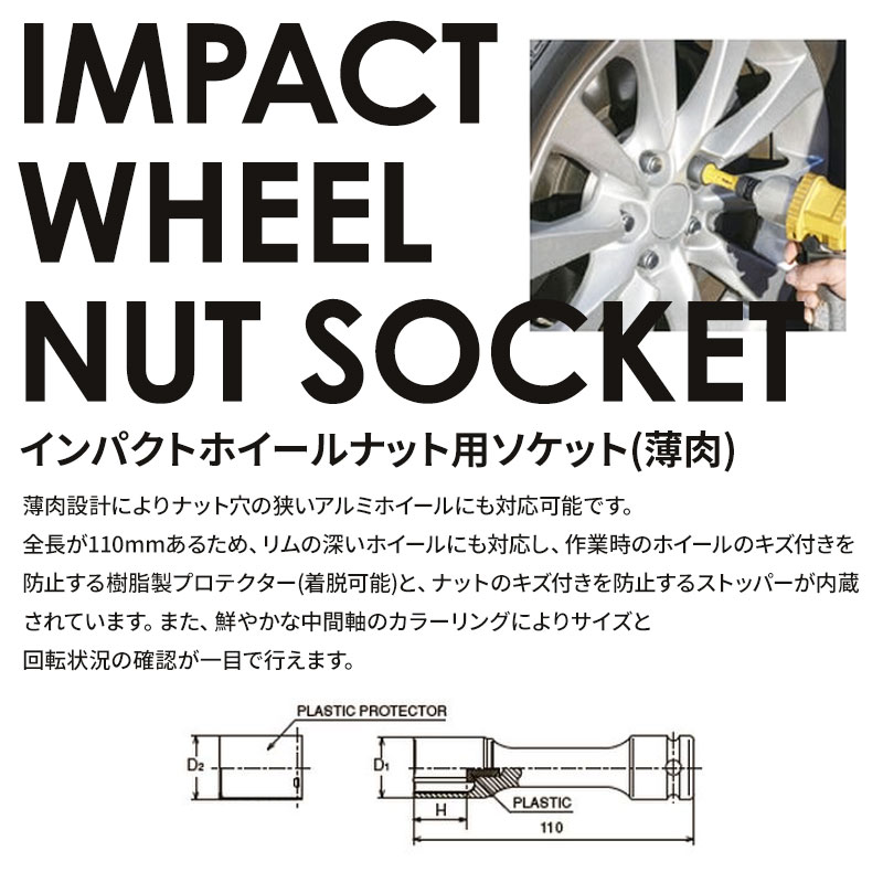 ■耐久性高く、ナットクリアランスの狭いホイールや、ナット穴が深いホイールにも使用可能!ホイールプロテクター付きでソケットの回転でホイールを痛めることなくナットを緩めることが出来ます!