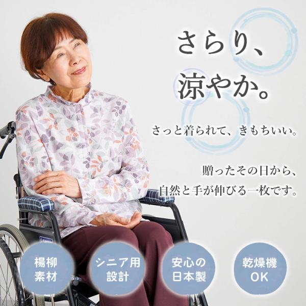 ● 介護施設での毎日にちょうどいい、楊柳(ようりゅう)素材の前開きブラウスです。肌に貼りつきにくくムレにくいので、春?秋まで快適に着られます。