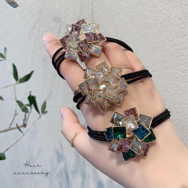 【商品説明】スクエアビジューがキラキラと極上の輝きを放つビジューヘアゴム。見ているだけでうっとりとするその輝きはヘアスタイルを上品に、華やかに仕上げます。高級感があり、美しいヘアゴムはプレゼントとしてもおススメ♪