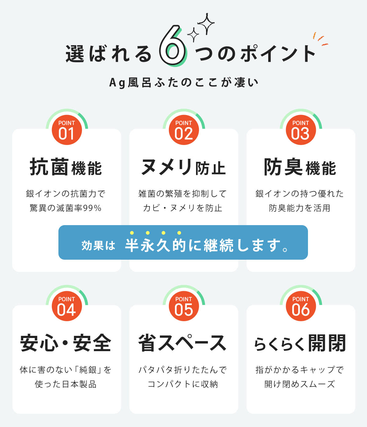 ●銀イオン配合で衛生的な省スペースに収納できる折りたたみ式風呂ふたです。
