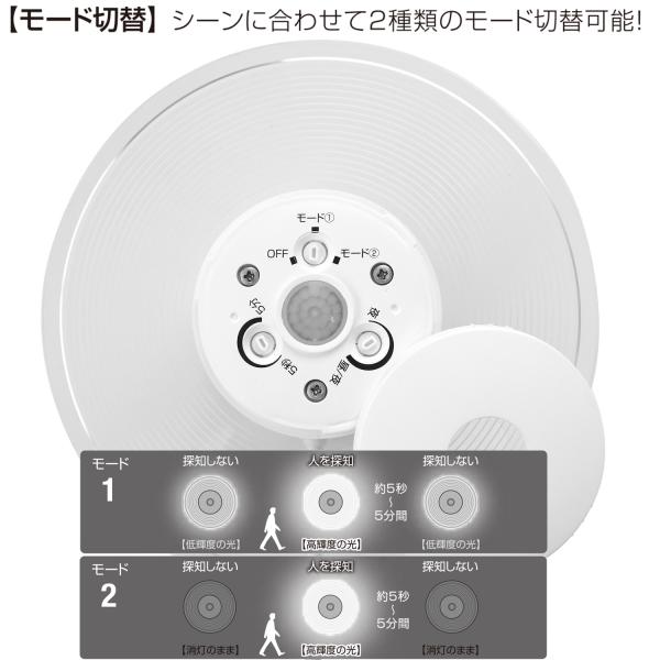 モード1:低輝度で点灯し、人を探知すると高輝度で約5秒〜5分点灯した後、自動で低輝度に切り替わり点灯し続けます