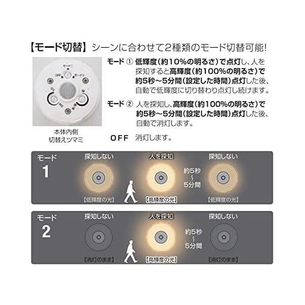 モード2:人を探知し、高輝度で約5秒〜5分間点灯した後、自動で低輝度に切り替わり点灯し続けます