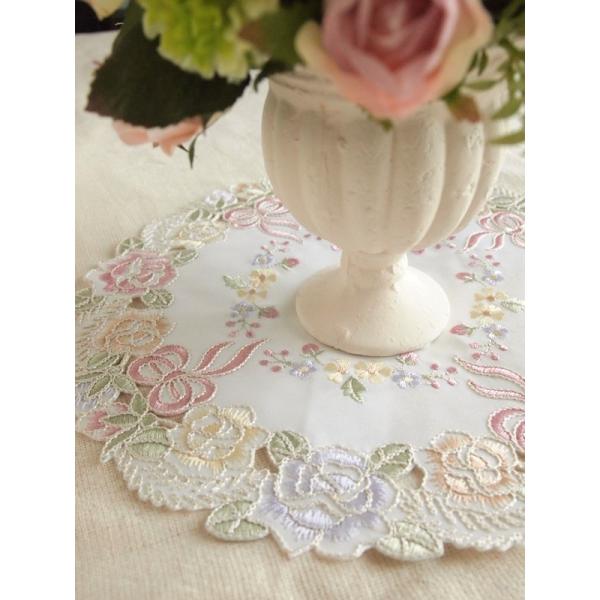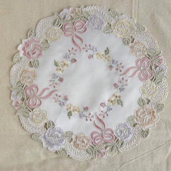 花瓶敷 25cm アンティークレース風 高級コード刺繍ドイリー リボン&ローズ