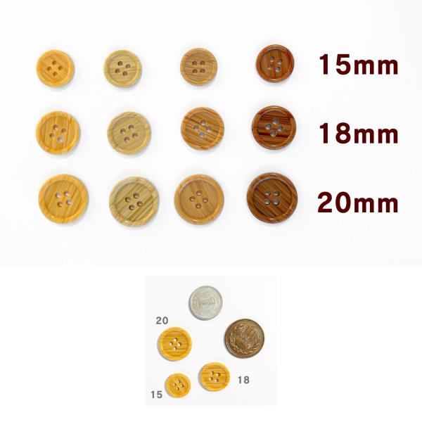 18ミリ 1.8cm 18ミリ 丸型 丸い まるい シンプル フチあり 縁あり フチあり 艶あり 薄茶色 焦茶 肌色 木目調 木のような模様 樹脂釦 洗える 洗濯可 ぼたん 釦 木製風 木目模様 可愛い お洒落 かわいい オシャレ 裁縫 洋裁 小物用 ポーチ用 スーツ用 ジャケット用