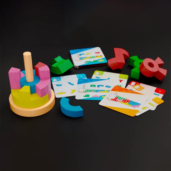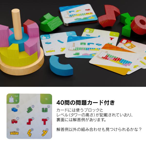 「カタミノ」が(平面パズルによる)図形感覚を育むのに対し、「カタミノ・タワー」は(立体パズルによる)数量感覚を育むのに役立ちます。