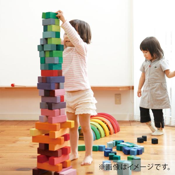 積み木としてはもちろん、グラデーションをたのしんだり、他のおもちゃと組み合わせて遊ぶのもおすすめです。