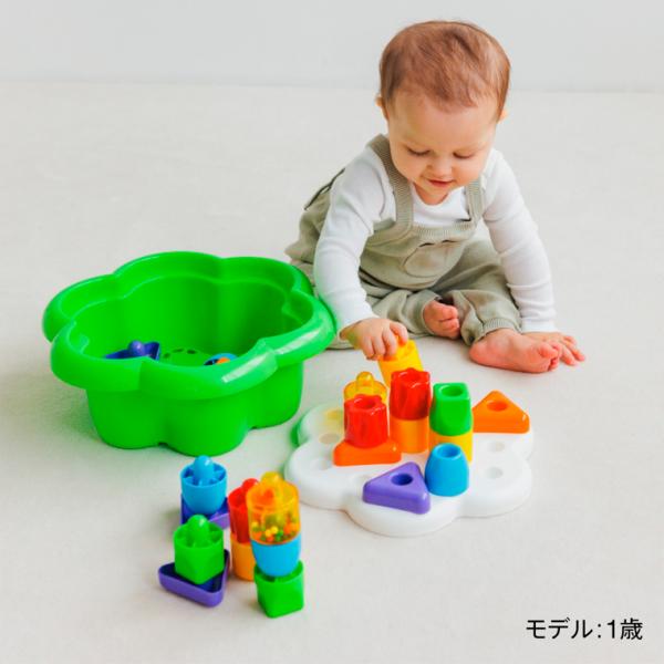 お花の形の収納ボックスは、ふたの部分が積み上げあそびの土台となったり、ブロックをしまって「ないない」あそびができたりと大活躍します。