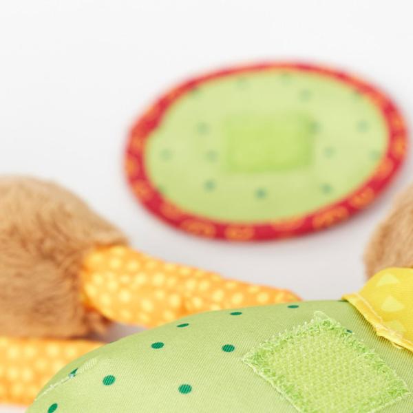 ぬいぐるみの体や手足などに歯固め・鈴の音などのしかけ付きで、赤ちゃんの触覚を刺激します。