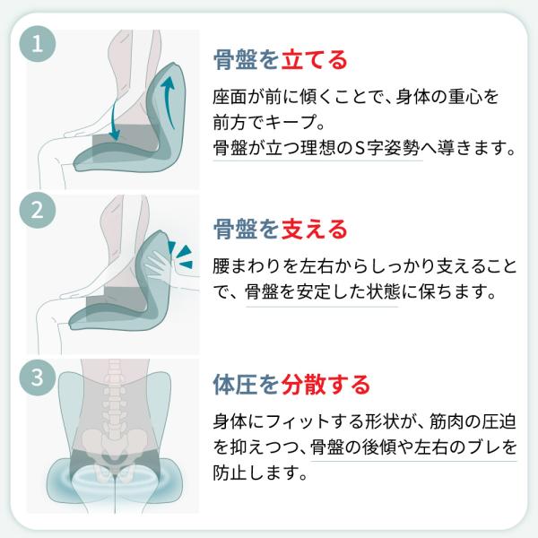 体圧を均一に分散する設計。局所的な圧を抑え、長時間でも疲れにくい