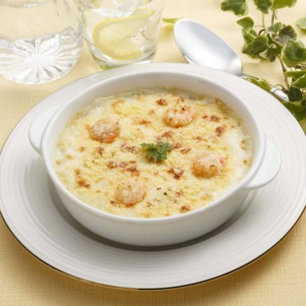 白ワインでソテーした海老のエキスを加えたホワイトソースは、風味豊かに炊き上げたバターライスとの相性も絶妙。トッピングしたナチュラルチーズとともに香ばしく焼き上げることで、海老の旨味がつまったドリアの美味しさが一層引き立ちます。