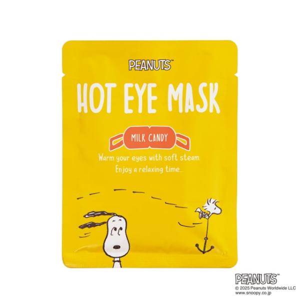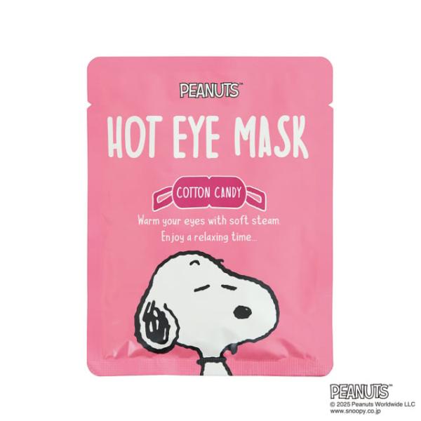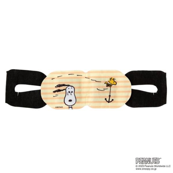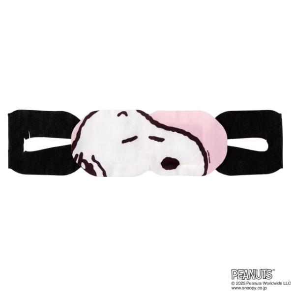 スヌーピーの耳をイメージした黒の耳掛けと、ピーナッツアートがかわいいホットアイマスク。
