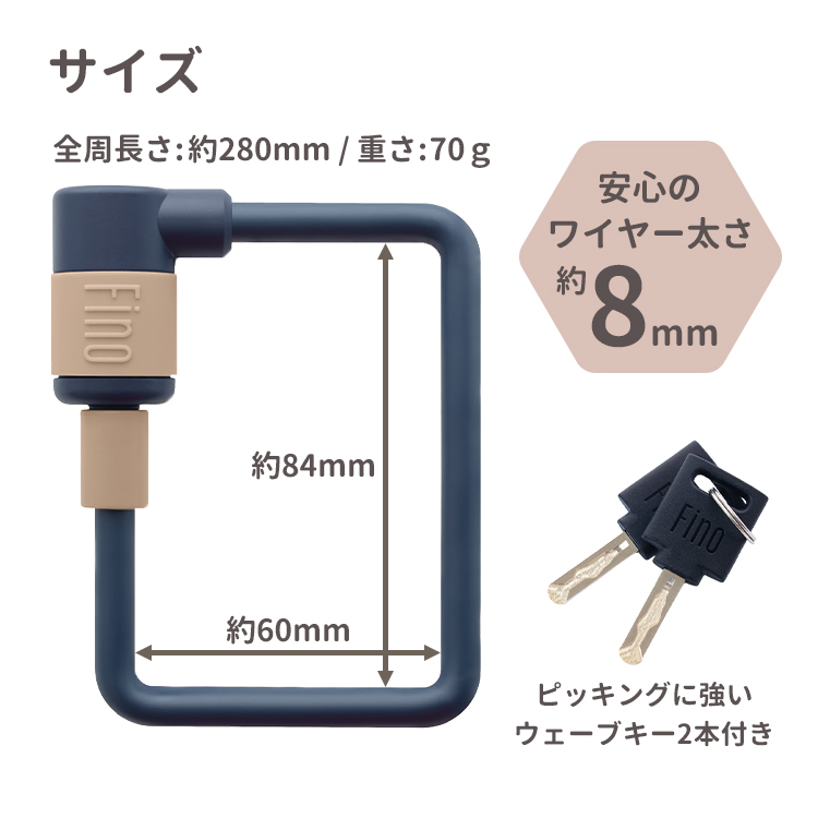 電動アシスト自転車用バッテリーロック キータイプ Fino LM-03 ワイヤー錠 ピンク ベージュ グレー Φ8mm×280mm キー2本付き メール便発送