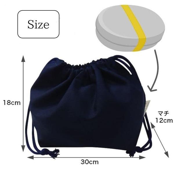 お弁当箱やランチの食べ物を入れるのにちょうどよい、幅広のマチがある巾着袋です。