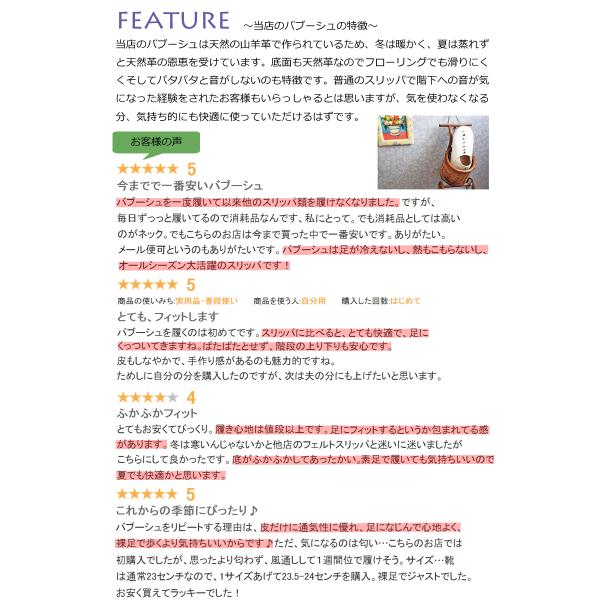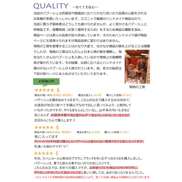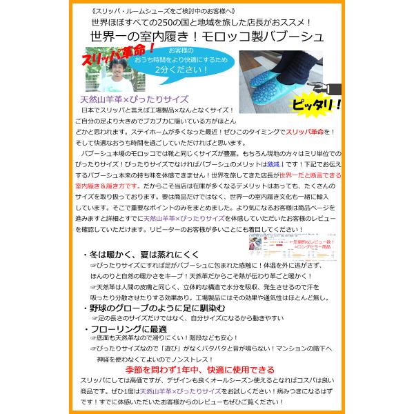 モロッコの職人さんが作る室内用バブーシュです。この数年でだいぶ認知されるようになってきました。スリッパとしては本革なので高価とはなりますが、天然革のため夏は蒸れず冬は暖かく、本革なのでグローブのように足に馴染み、定期的にご購入されるお客様が増えてきました。工場で作られるスリッパとは全く異なるので一度試していただければ幸いです。スリッパとしては高価ではありますが、プレゼントとしては手頃な価格で見た目もよく本革&シンプルなので父の日、母の日、敬老の日、誕生日などのギフトに喜んでいただけているのがレビューにて伝わってきております。