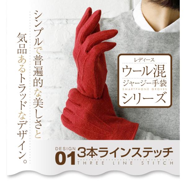 【クーポン利用で100円OFF!】 手袋 レディース 暖かい スマホ対応 かわいい スマホ 冬 防寒 指あり 5本指 ウール混 ジャージー生地 3本ラインステッチ 無地