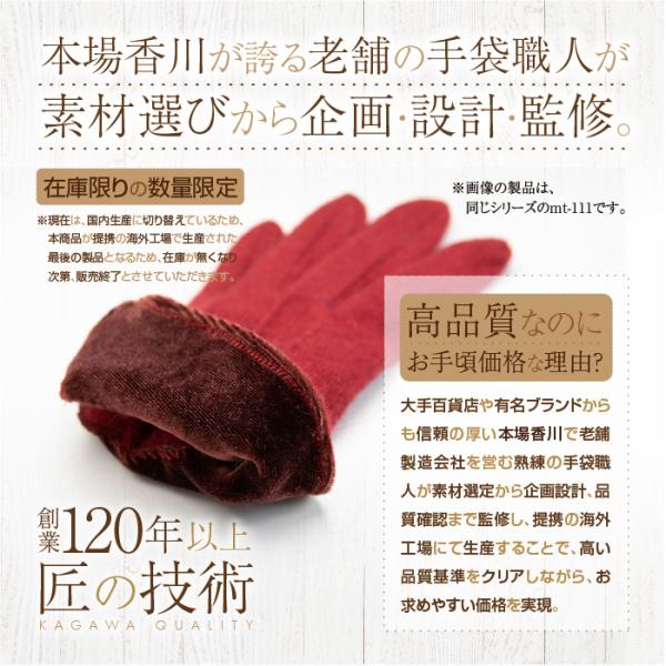 国内で企画・設計・生産されている手袋の約90%以上は、「香川県」で作られています。本場香川で創業120年以上の歴史を受け継ぐ熟練の手袋職人が、素材選びから企画・設計・監修までしっかり確認し、有名ブランドや大手百貨店からも信頼の厚いその高いクオリティを惜しみなく提携の海外工場にて再現した「レディース ウール混ジャージースマホ対応手袋シリーズ」。デザインは、この他全部で10種類。カラーは各デザイン5〜6色からお選びいただけます。
