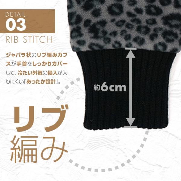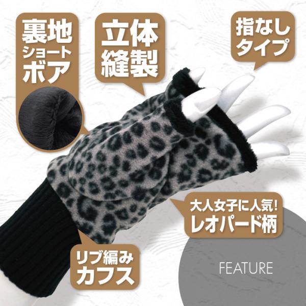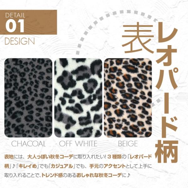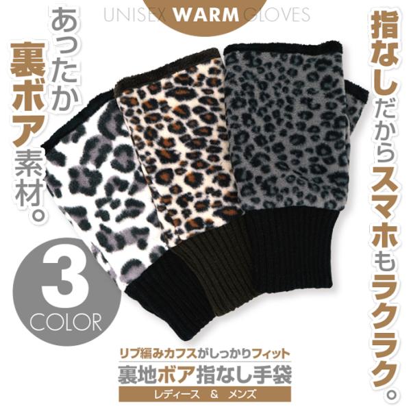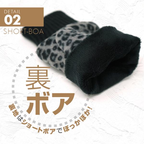 「裏地ボア指なし手袋 リブ編みカフス レオパード柄 ヒョウ柄 全3色」