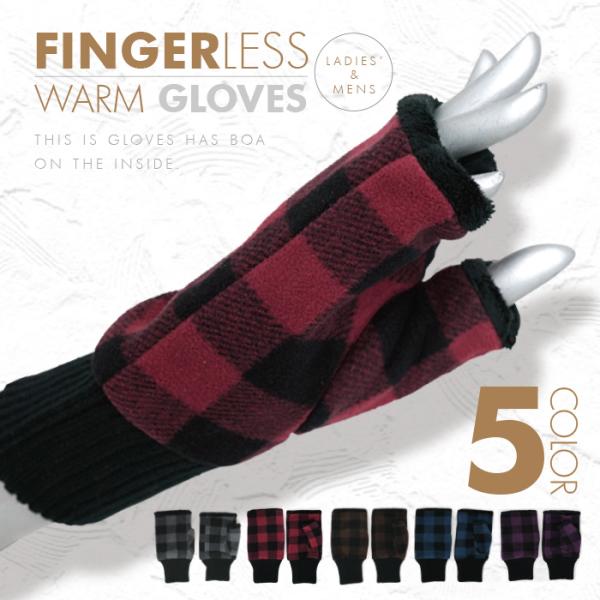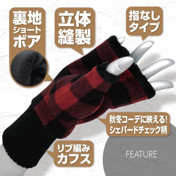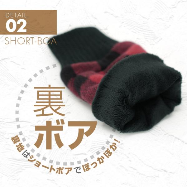 「裏地ボア指なし手袋 リブ編みカフス シェパードチェック柄 全5色」