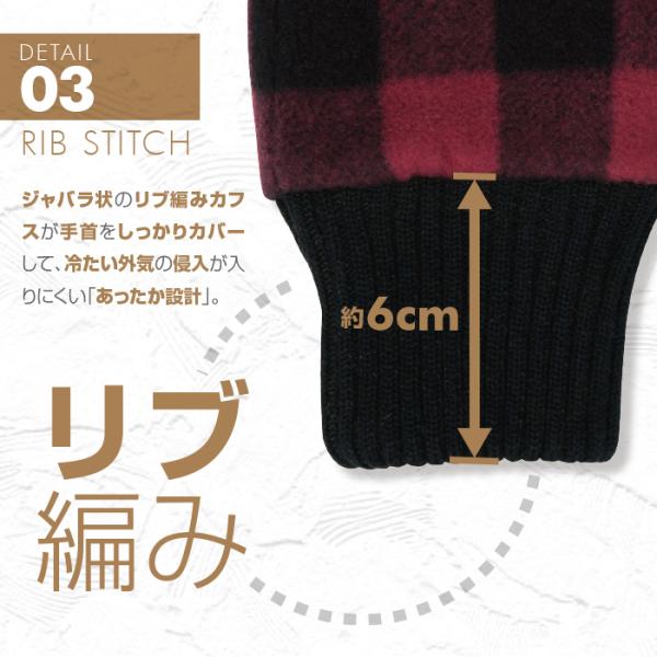 指なしタイプなので、指先自由にスマホやパソコンもラクラク操作♪裏地は、ボリュームがありながら軽量で暖かいショートボア。カフス部分はリブ編み仕様で、手首をしっかりカバーし、冷たい外気が侵入しにくい「あったか設計」♪親指部分が立体的に縫製されているので、動かしやすく、生地が突っ張りにくい。表地は秋冬コーデに欠かせない「シェパードチェック柄」♪秋冬らしいシックな色合いで、カジュアルはもちろん、通勤、通学、ビジネスシーンにも映える大人かっこいいデザイン♪