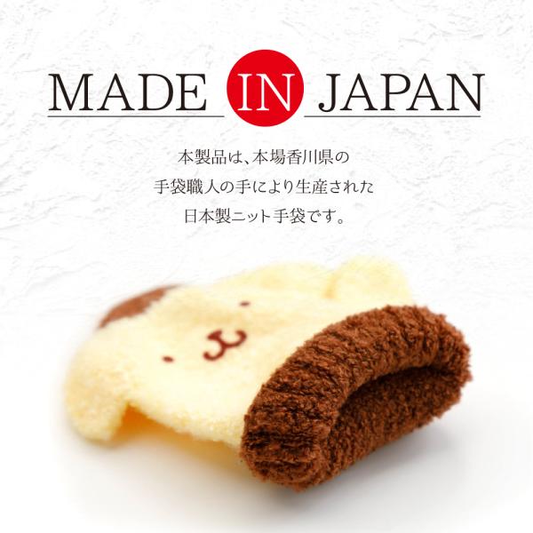 かわいいポムポムプリンがあったかミトン手袋に♪伸縮性に優れたのびのび素材を使用しているので、やさしい着け心地♪気温の下がる季節や冷え込む朝、夕のお出かけに大活躍してくれます♪また、厚めのカフス部分は、冷たい外気が内部に入り込みにくいあったか設計♪もちろん安心安全の日本製です♪