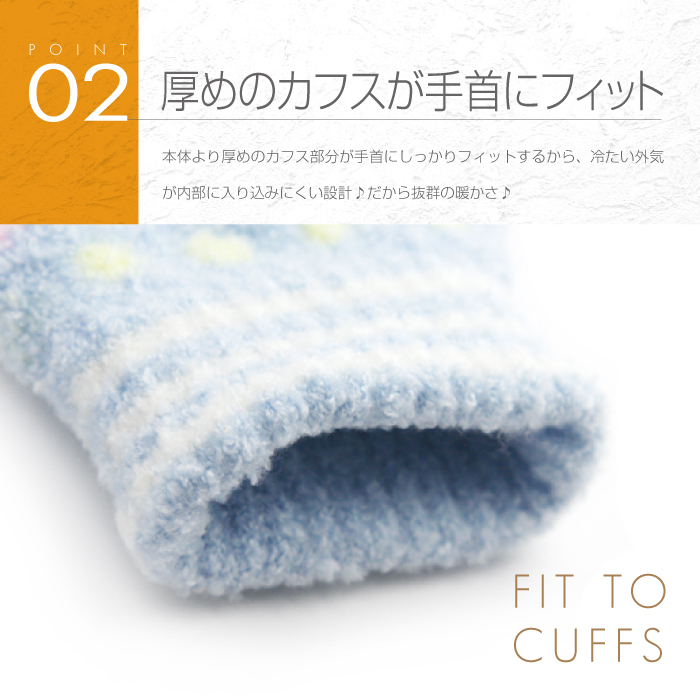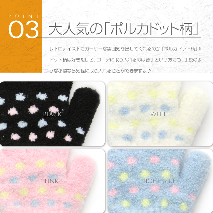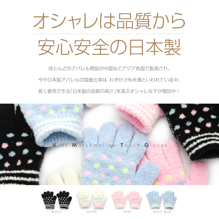 圧倒的に軽くて柔らかい「マシュマロタッチ糸」を使用したキッズ手袋♪ストレッチ性に優れたリブ編みカフスが手首にしっかりフィットし、冷気が中に入り込みにくい「保温設計」♪人気の「ポルカドット柄(水玉)」のガーリーテイスト♪カラーは全4色♪品質の日本製。